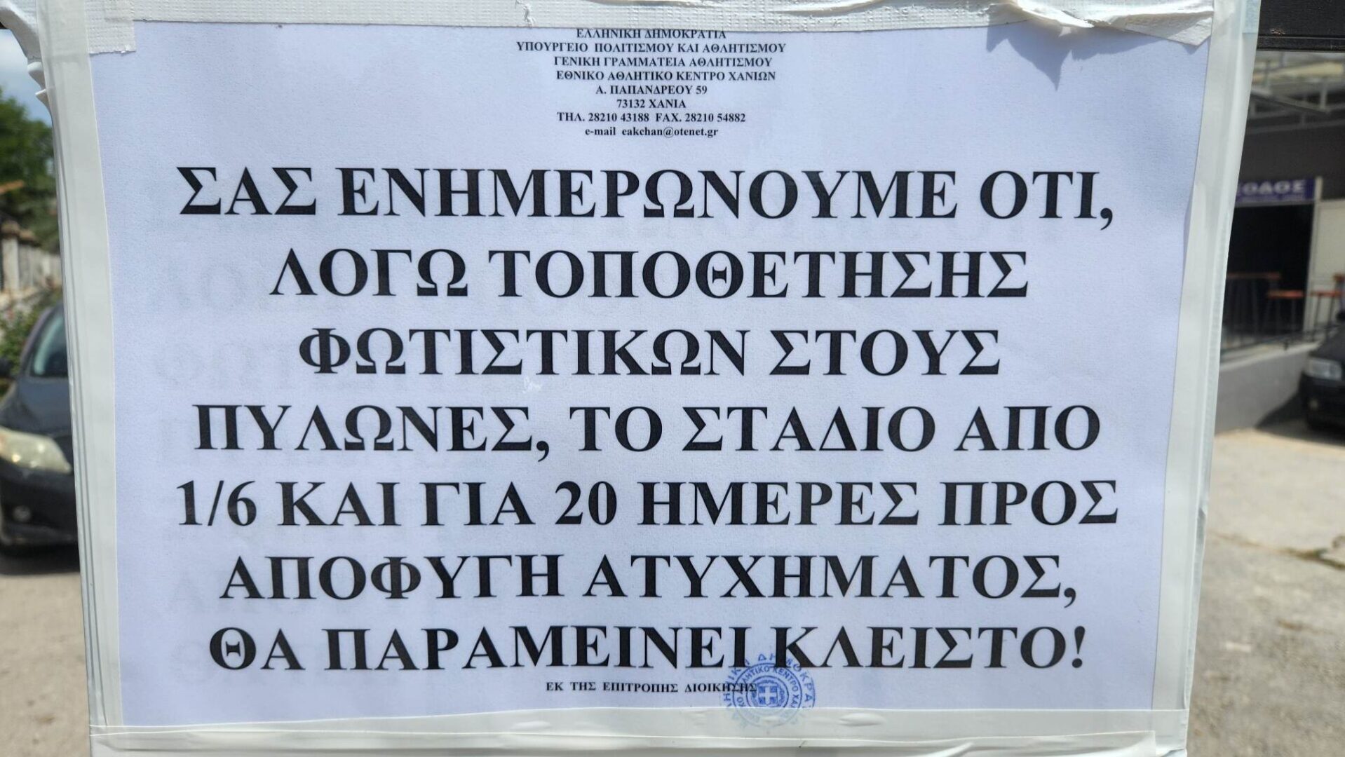 Ενημερώνουμε το φίλαθλο κοινό των Χανίων και τους χρήστες της εγκατάστασης του Εθνικού Σταδίου πως από σήμερα 1 Ιουνίου ξεκίνησαν οι εργασίες για την ενεργειακή αναβάθμιση του ηλεκτροφωτισμού.