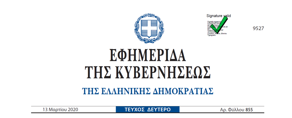 Government Gazette 855/B/13-3-2020 – Imposition of the measure of the temporary ban on the operation of individual private businesses, museums, archaeological and historical sites, sports facilities, as well as places of public gathering in general, throughout the Territory, for the period from 14.3.2020 to 27.3.2020.